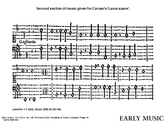 I agree with these identifications of the first and third sections. But I am not convinced that the central section is a gagliarda. It’s not a problem that the first phrase starts with an upbeat qui | miri il sole – Lamothe’s gagliarda example from Caroso does this.