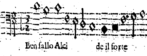But in the ballo ‘De la bellezza le dovute lodi’ the galliard is in 3/2 semibreves (which I take to be sesquialtera, i.e. three semibreves to two tactus beats). This is a slow tempo, and is set to the words Ben fallo Alcide il forte referring to that mythical strongman, Hercules.