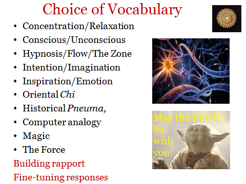 I vary my vocabulary, according to the student’s background. One can be scientific, and talk about intention and imagination; arty, with talk of magic and mystery; historical, with the 17th-century concept of Pneuma. Some students appreciate the computer-analogy; you sit at the keyboard, loading sub-routines into the computer, and then you hit RUN and leave the machine to operate at maximum efficiency without further keyboard input. Hungarian Flow-researcher Lazlo Stacho employs the vocabulary of Magic, recalling ancient connections between music and shamanism; there are still folk practices of hypnotism in Eastern Europe today. I find the Stars Wars idea of The Force helps some students find their own way to an understanding of these unconscious processes, that are hard to describe or measure.