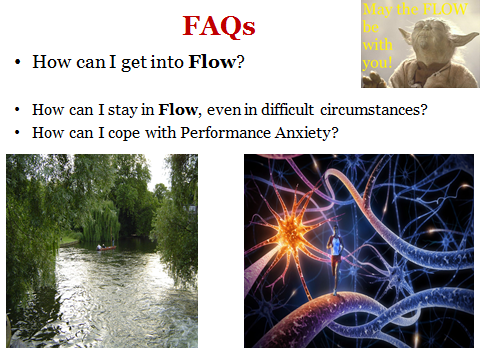 Then there is a huge Hypnotism industry worldwide, offering Hypnosis in face-to-face sessions, on CDs and DVDs, or for download from the internet. Help with losing weight, giving up smoking, relationship problems, phobias and anxiety is much in demand. Alongside these, and also in sports- and music-guru websites, Flow and other performance-enhancing concepts are marketed similarly. In these circles, it is taken for granted that Flow or ‘being in the Zone’ is the secret of elite performance, and that Hypnotism can help you achieve it. The most frequently asked questions are How can I get into Flow? How can I keep Flowing in difficult circumstances? How can I cope with Performance Anxiety?