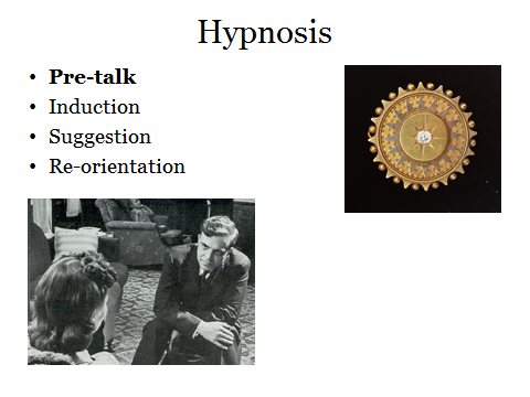So let’s look at a typical experience for a Client who visits a modern Hypnotist. There will be some introductory chat, which the experienced Hypnotist will utilise to build rapport, to find out what’s important to his Client, to explain the procedures of the session and to instill confidence. This phase is called the Pre-Talk, and a fine Hypnotist will be able to do a lot of effective work, before taking the Client into trance. An NLP practitioner might not draw any hard boundary between pre-talk and trance, regarding shifts of state as a natural process that is happening anyway.