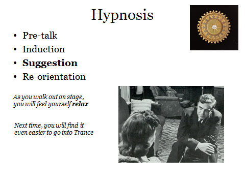 With the Client in trance, there may be a two-way conversation, or the Hypnotist may ask for non-verbal responses – raise your hand when you’re ready to continue . Typically, the Hypnotist gives Suggestions for desired responses to specific situations in the future. As you walk out on stage, and you take a deep breath, you will feel your shoulders relax, and your whole body feels warm and relaxed. with a pleasant sensation of calm confidence. Suggestions work without trance, especially if you use NLP techniques to aim the Suggestion direct at the Unconscious mind. But Suggestions work better with trance, and best of all with a combination of trance and NLP’s clever use of language.