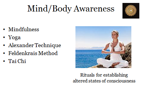 Many music conservatoires offer classes in Mindfulness, Yoga, Alexander Technique, Feldenkrais Method. Tai Chi and other disciplines teaching mind/body awareness. These are highly effective in improving concentration and relaxation, and instilling an effortless way to use the body that gradually becomes ‘second nature’, ‘automatic’. These outcomes help students enter the music-making trance more easily, and the teaching methods are also highly hypnotic.