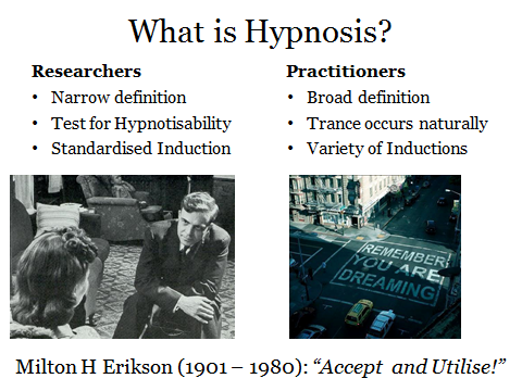Researchers tend to adopt a narrow definition of Hypnosis, requiring a formal induction and specified tests. Experimental work begins by testing subjects for hypnotisability, using a Standardised Induction. Most practitioners work with a broad definition, using a great variety of inductions, formal and informal. The guru of modern hypnotism was Milton H Erikson, who viewed trance as a natural phenomenon, a state we all go in and out of several times a day.