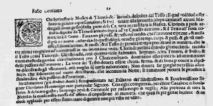 “Combat of Trancredi & Clorinda in Music, described by Tasso, which needs to be done in show style: they enter suddenly (after some madrigals without action have been sung)…. They make their steps and gestures just as the delivery of the text expounds, neither more nor less, observing carefully the tempi, sword-strikes and foot-work; the instrumentalists [observe carefully] the violent and soft sounds; and the Narrator [observes] the well-timed pronunciation of the words – in such a way that the three actions come to meet in a unified representation. ”