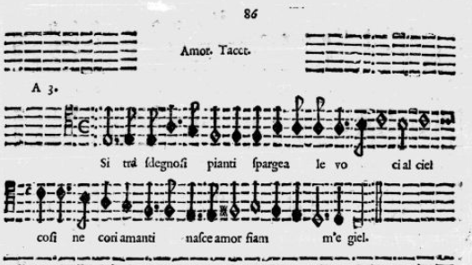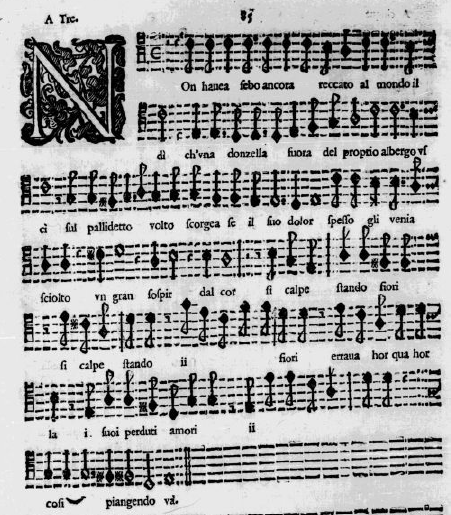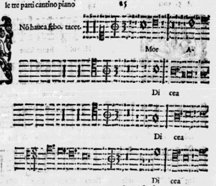 The three parts that sing outside the cries of the Nymph are placed separately like this, because they sing in the time of the hand; the other three parts, which go in soft voice commiserating the Nymph are placed in score, in order to follow the crying of that girl, which is sung in the time of the affection of the spirit, and not in that of the hand.