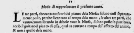 Another 20th-century misunderstanding should be quickly mentioned: ‘the three parts’ which ‘are placed separately’ means that the three individual voice-parts and continuo accompaniment were placed in four different part-books, whereas the central Lament is printed in score. There is no suggestion that the three singers should be ‘placed separately’, i.e occupy another area of the stage, at some great distance from the solo Nymph!