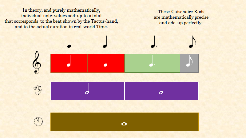 The Tactus-beat is human, rather than metronomic. The down-up movement has the almost imperceptible ebb and flow of arsis & thesis (look very carefully at the Tactus-Cuisenaire rods in my last example). And the Speed of the movement, which in principle is always the same, changes subtly in practice according to performance venue, ensemble forces, emotional state etc. It does not have to be precisely the same, from one occasion to another [for all this, see Zacconi, above], but you should keep it steady, as much as humanly possible.