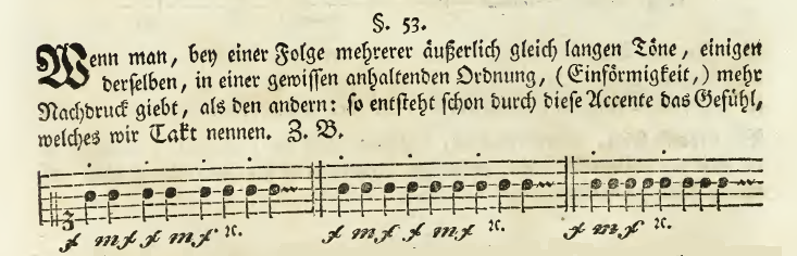 As we still do today, Türk associates Takt – in the sense of Metre – with accent. And so his first definition would have shocked Zacconi: Wenn man, bey einer Folge mehrerer äuserlich gleich langen Töne, einigen derselben, in einer gewissen anhaltenden Ordnung, (Einförmigkeit), mehr Nachdruck giebt, als den andern: so entsteht schon durch diese Accente das Gefühl, welches wir Takt nennen. When, in a succession of many apparently equally-long notes, you give some of them more emphasis in a certain consistent pattern (uniformity): then these Accents produce the feeling that we call Metre.