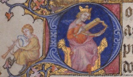 Medieval hierarchy of instruments: King David, crowned in gold, sits with his harp on a golden throne; a lowly piper sits on the ground.