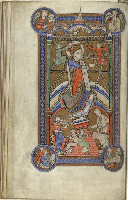 In this medieval Psalter, God hands down from heaven musical intervals, perhaps even specific pitches, to bell ringers, to King David and to more lowly instruments. Ladders represent hexachord scales.