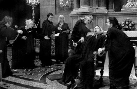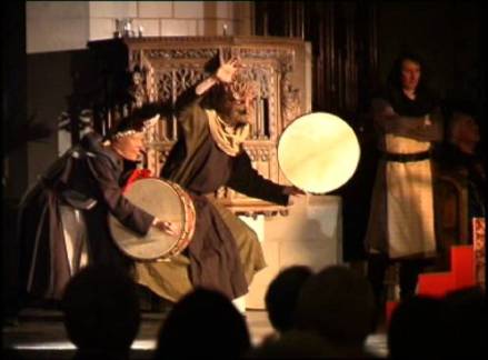 By 2011, we had added a lot of detail to the historical action, and developed a new dramatic ‘frame’ for a production in collaboration with Ars Nova, Denmark. To the essential elements of processions and partying were added medieval gesture, including St Benedict’s seven postures of prayer, and better stylised, more sharply defined movement styles for monks, courtiers and soldiers. See Schmitt La Raison des gestes (1991).  Medieval art provided inspiring images of powerful gestures, for example when Darius commands that Daniel be brought out of the Lions’ Den, and the Evil Counsellors thrown in!