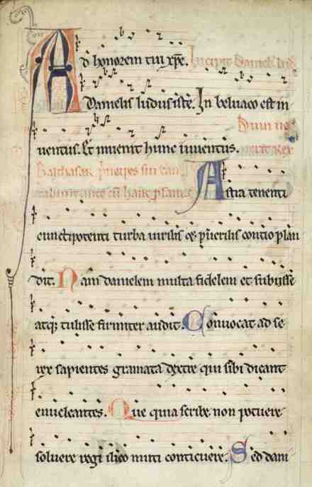 The Play of Daniel, Ludus Danielis, was created in the late 12th century at Beavais Cathedral in northern France, and notated in the early 1200s in the Egerton MS 2615, now in the British Library. William Smoldon, who edited it for the Plainsong and Medieval Musical Society in 1960, described it as a ‘medieval opera’: academically, it would be categorised as Liturgical Drama. The work was made famous in the USA in Noah Greenberg’s operatic production, premiered in Washington’s National Cathedral in 1958, which gave many spectators their first experience of Early Music. [In another context, I’m honoured to be a recipient of the Noah Greenberg prize for musicological/performance collaboration.]