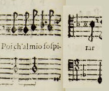 For comparison, here is the notated accento in Monteverdi’s La Musica Prologue to Orfeo. At the words dolci accenti (sweet accents) the singer first ascends in order then to descend onto an expressive Bb on the good syllable.