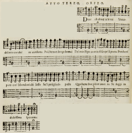 As well as all this delightful monody, there are Orfeo’s set-piece arias – the dance-song Vi ricorda just before the Messaggiera’s entrance with the news of Euridice’s death, Possente Spirto with its elaborate passaggi and Qual honor over a walking bass; the song-like Ecco pur, ch’a voi ritorno [the original notation implies a slow tempo around minim = 60, not a fast Proportion] and the diegetic song Rosa del Ciel in the most artful style of monody; as well as all the charming ensemble-music.