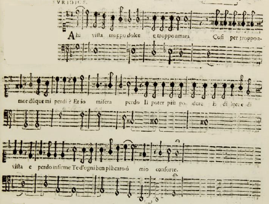 The success of Monteverdi’s (1608) Arianna was greatly influenced by the performance of Commedia actress Virginia Ramponi-Andreini ‘La Florinda’ in the title-role, her dramatic skills in lament-scenes complementing the musical skills of the court singers in ensemble music and arias. More about Arianna…