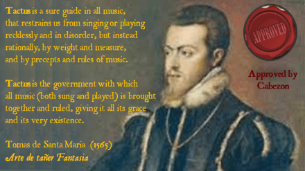 ‘El compas, en el qual estriva toda la musica practica… Tactus, on which all music-making is founded. ‘Toda la musica, assi del cantar como del tañer, esta subjectada y atajada al compas, y no la compas ala musica. All music, both vocal and instrumental, is governed by and founded on Tactus, and not the other way around.