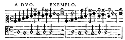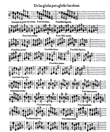Part 1 begins with the names of the notes in plainchant (canto llano) and staff-notation (canto de organo); the three Hexachords (propriedades); the contradiction between the hard and soft Hexachords (see below); changing Hexachord (mutacion); the two pre-requisites for singing from staff-notation.