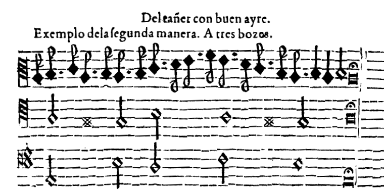 Tomas’ emphasis on staff-notation and deep understanding of counterpoint takes his book into territory beyond that explored by Milán in El maestro (1536). Milán uses tablature notation, which tells the vihuela-player which string to pluck with the right hand and which fret to stop with the left hand, note by note, and with careful control of rhythm. But this notation does not show the movement of the individual polyphonic voices, and Milán allows more freedom than Tomas de Santa Maria in adapting the strict rules of counterpoint to the exigencies of a particular instrument. Although Milán requires basic knowledge of staff-notation, his students learn to improvise polyphony mostly by ear and by ‘muscle memory’, by learning the stops and plucks that create the progressions and cadences of each mode. Tomas teaches staff-notation in detail and wants his students to learn counterpoint as an academic, as well as practical, exercise. But both writers encourage students to play good music, in order to learn by example, reproducing and imitating learnt musical fragments in their own improvised fantasias.