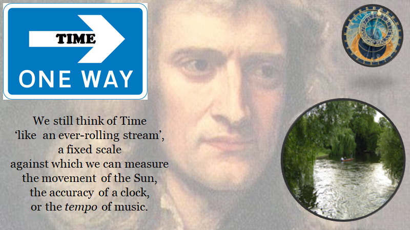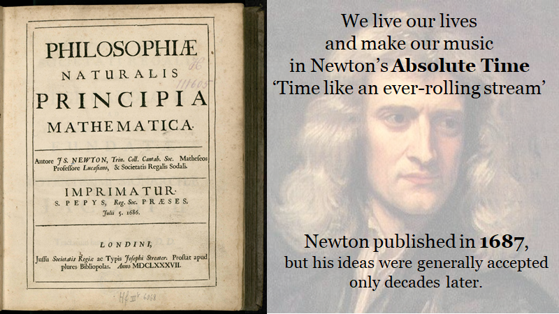 We live our everyday lives and make music within a pre-1900 understanding of Time ‘like an ever-rolling stream’. This is Newton’s concept of Absolute Time, first published in his 1687 Principia, and bitterly contested amongst mathematicians for decades afterwards. Amongst 18th-century musicians and the general public, acceptance of Newtonian ideas must have lagged even further behind, just as for most of us today, Hawking’s Brief History of Time (1988) remains counter-intuitive.