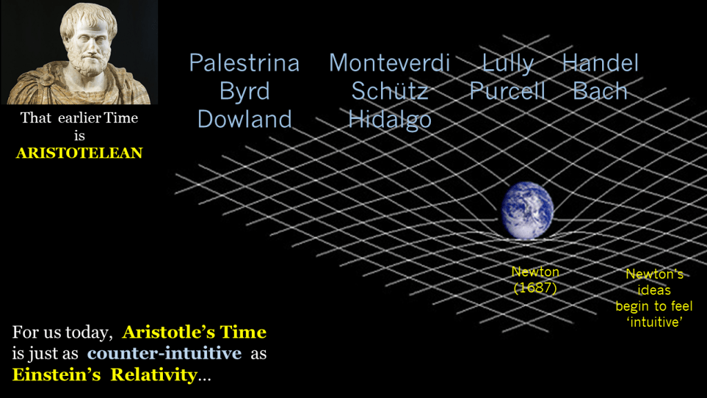 In this sense, the works of Josquin, Dowland & Monteverdi, even Lully & Purcell, are ‘music of an earlier Time’. Until Newton, Time was defined by Aristotle’s Physics (4th cent. BC) as ‘a number of change/motion in respect of before and after’.