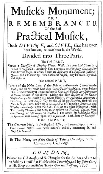 My provocation drew the hoped-for riposte, with a suggestion that 17th-century lutenist Thomas Mace thought that ‘playing in time is [only] for beginners’. This suggestion, and the mis-reading of period texts as if they supported it, is so commonly encountered, that I took up the challenge, and re-read the whole of Mace’s 1676 treatise Musick’s Monument to find out what Thomas actually wrote.