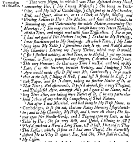 Mace’s verbal directions are ‘to Play Soft and Loud, as you see it marked’; ‘use the Sting (vibrato) where you see it set, and the Spinger after it’; ‘observe the slides and slurs, and you cannot fail to know My Mistress’s Humour, provided you keep True Time, which you must be extremely careful to do in all lessons: